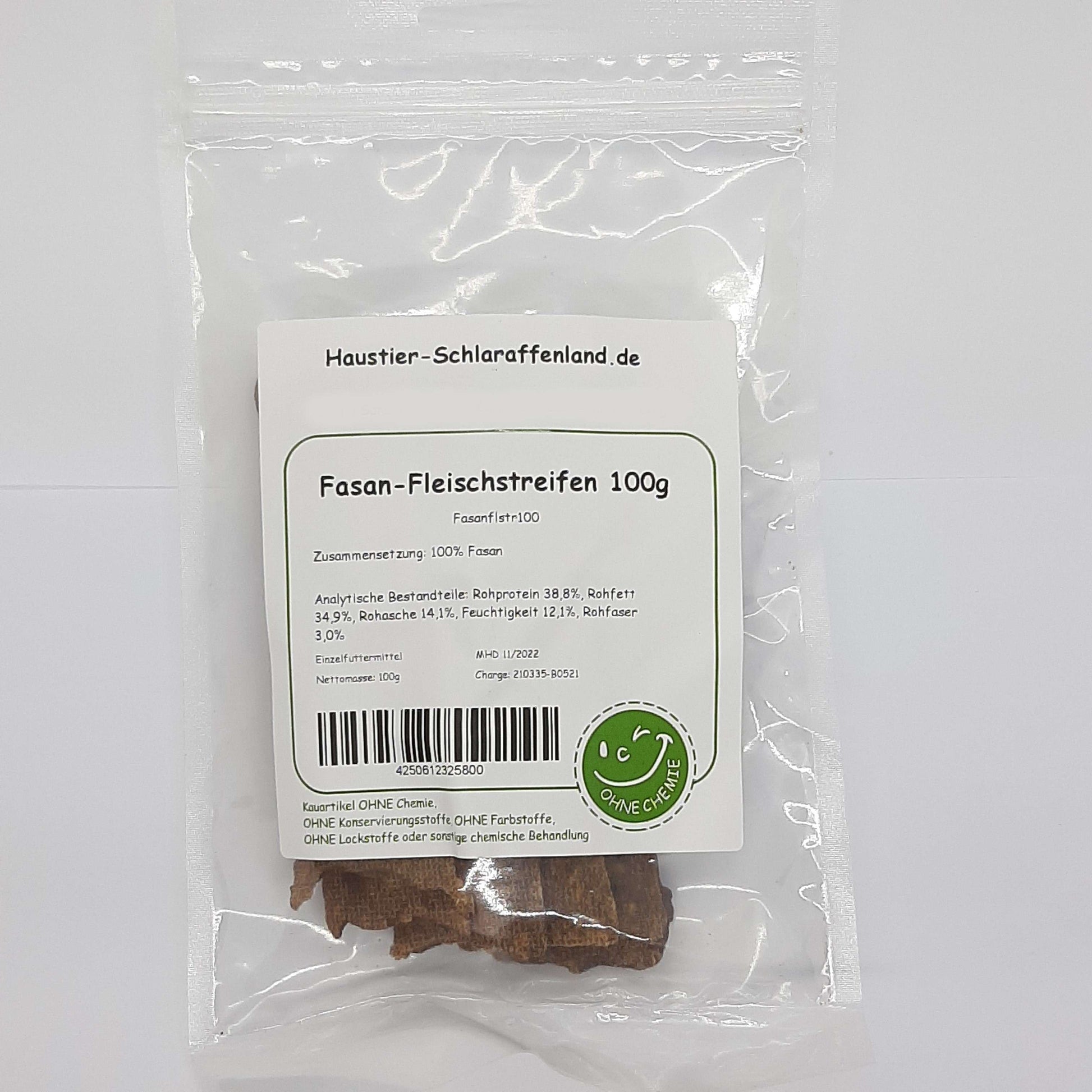 Diese hochwertige Spezialität wird Deinen Vierbeiner bestimmt begeistern. Fasan-Fleischstreifen sind aus hochwertigem puren Fasan-Fleisch mit viel Eiweiß zubereitet – ohne Zusatzstoffe! Die Fleischstreifen werden schonend getrocknet und sie sind auch für Welpen geeignet. Man kann die Streifen auch leicht zerkleinern und somit auch kleineren Hunden geben oder sie einfach als Leckerlies zwischendurch geben! Streifen für Streifen ein artgerechter Genuß! Fleischig und herzhaft, als Zwischenmahlzeit oder zur Belohnung geeignet.as Produkt ist nicht so hart und somit auch für Welpen und Senioren geeignet.