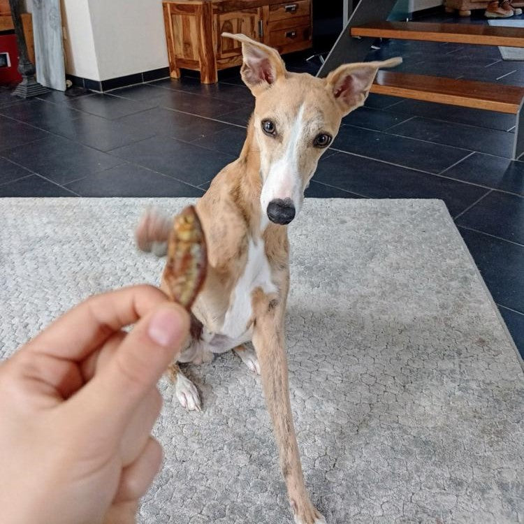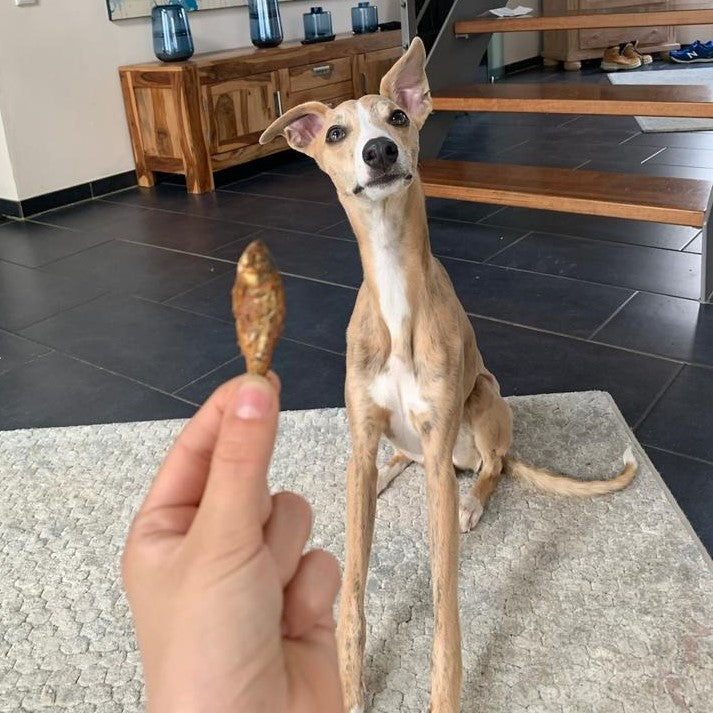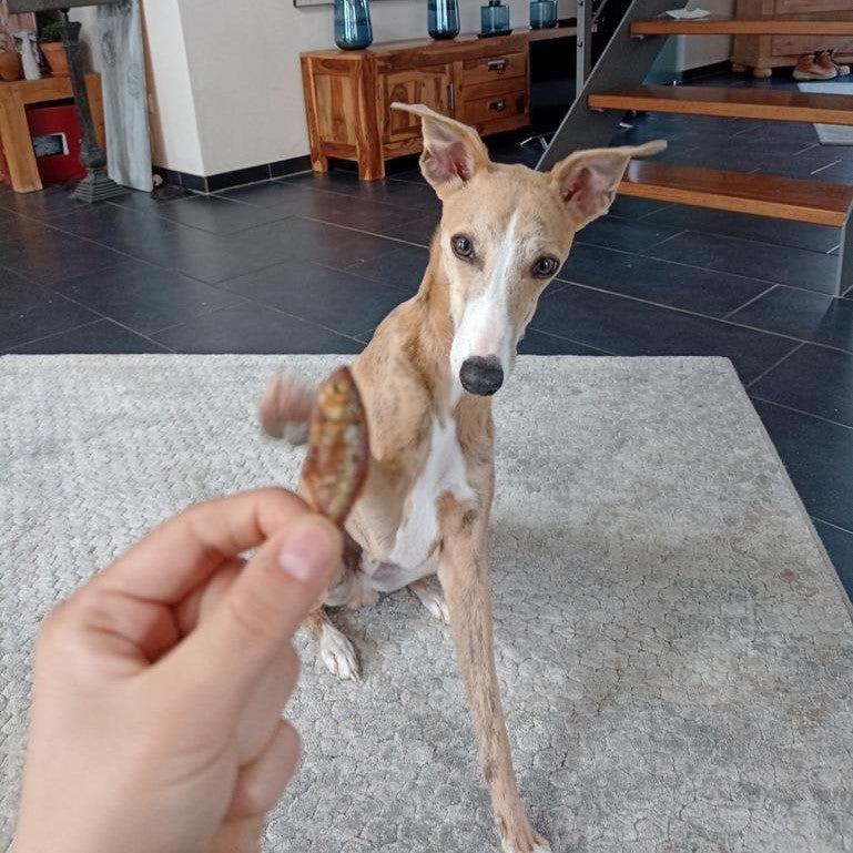 Auch unsere Test-Fellnase AYK liebt diesen fischigen Kau-Snack. Laut Frauchen Diana sind die Heringe der "absolute Hammer" und für ein Training gut zu nutzen! War sicherlich gar nicht so einfach die Produktfotos zu schiessen - bei den kleinen Fischen! Vielen leiben Dank dafür nach Vosswinkel! Auch unsere Border-Collie-Labrador-Dame Kleo aus dem Cuxhavener Land mag die Heringe liebend gerne.