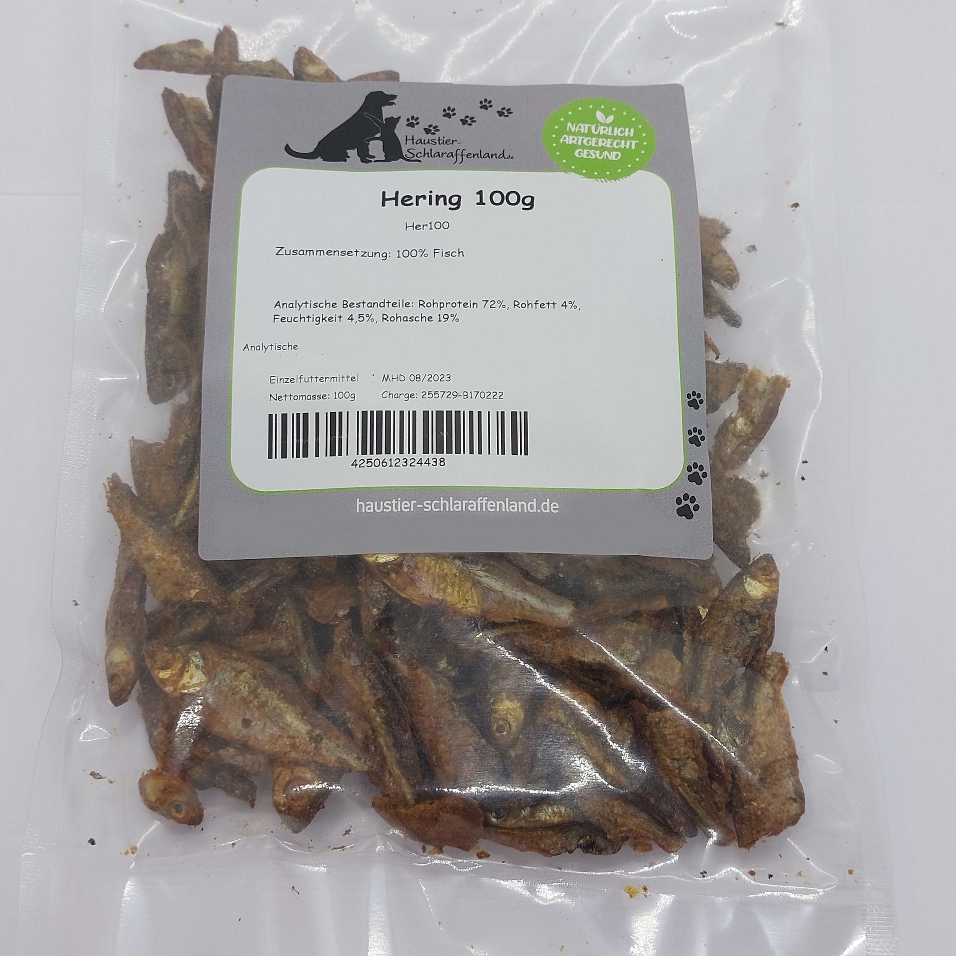 Unsere Heringe für Hunde und Katzen erzielen durch die Herstellung im schonenden Trocknungsverfahren einen geringen Fett- und hohen Rohproteinanteil. Dadurch eignen sie sich also auch optimal für leichtfuttrige Hunde und sie sind ein gesundes Leckerli für zwischendurch. Die winzigen Fische sind natürlich besonders gut geeignet für kleinere Rassen. Beim Trocknungsverfahren lösen sich oftmals die Köpfe, Schwänze und andere Fischkörperteile. Im gelieferten Paket sind ganze Fische eher die Seltenheit! Der Abschnitt fällt mit in die Packung. Auf den Produktfotos seht Ihr ca. 20 ganze Fische aus einer 100 Gramm-Packung! Wir verkaufen die Heringe somit als Bruchware oder als Brösel-Heringe. Eure Fellnasen lieben diesen Geruch! Man kann die Heringe auch besonders gut als Topping zum Nass- oder Trockenfutter beifügen! Einfach mal ausprobieren!