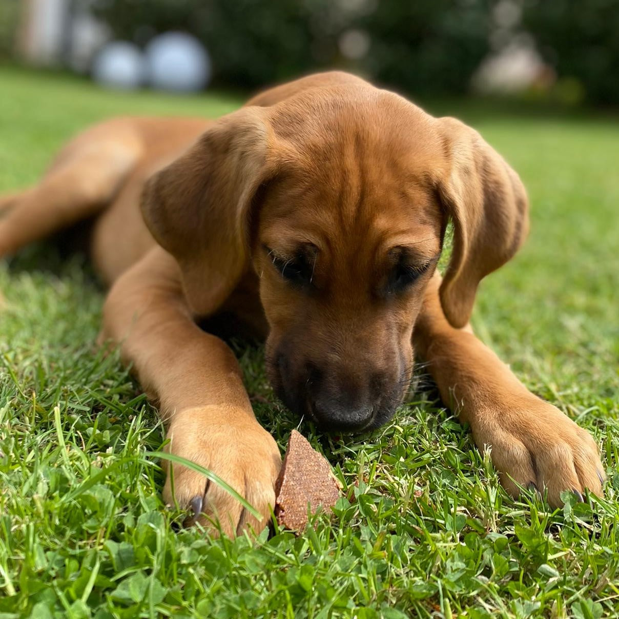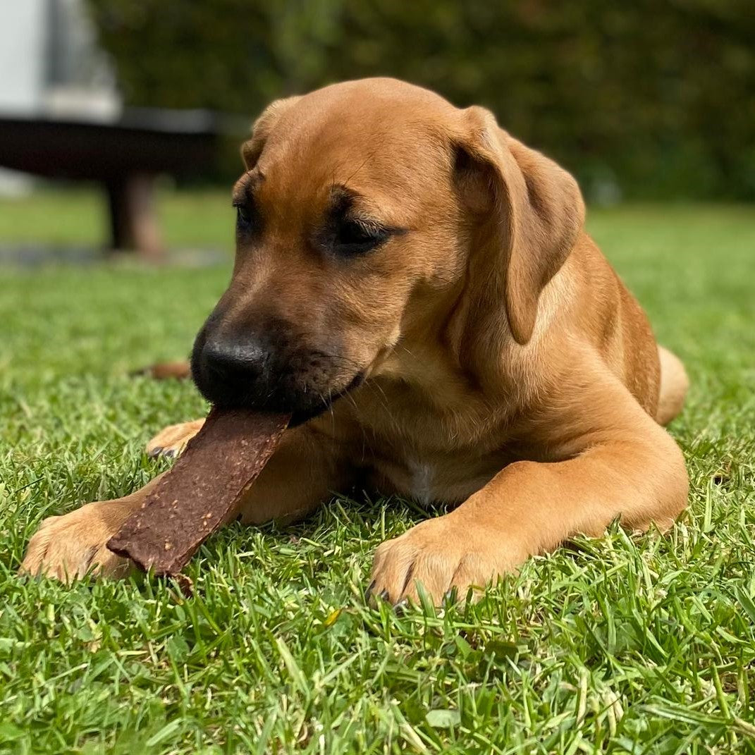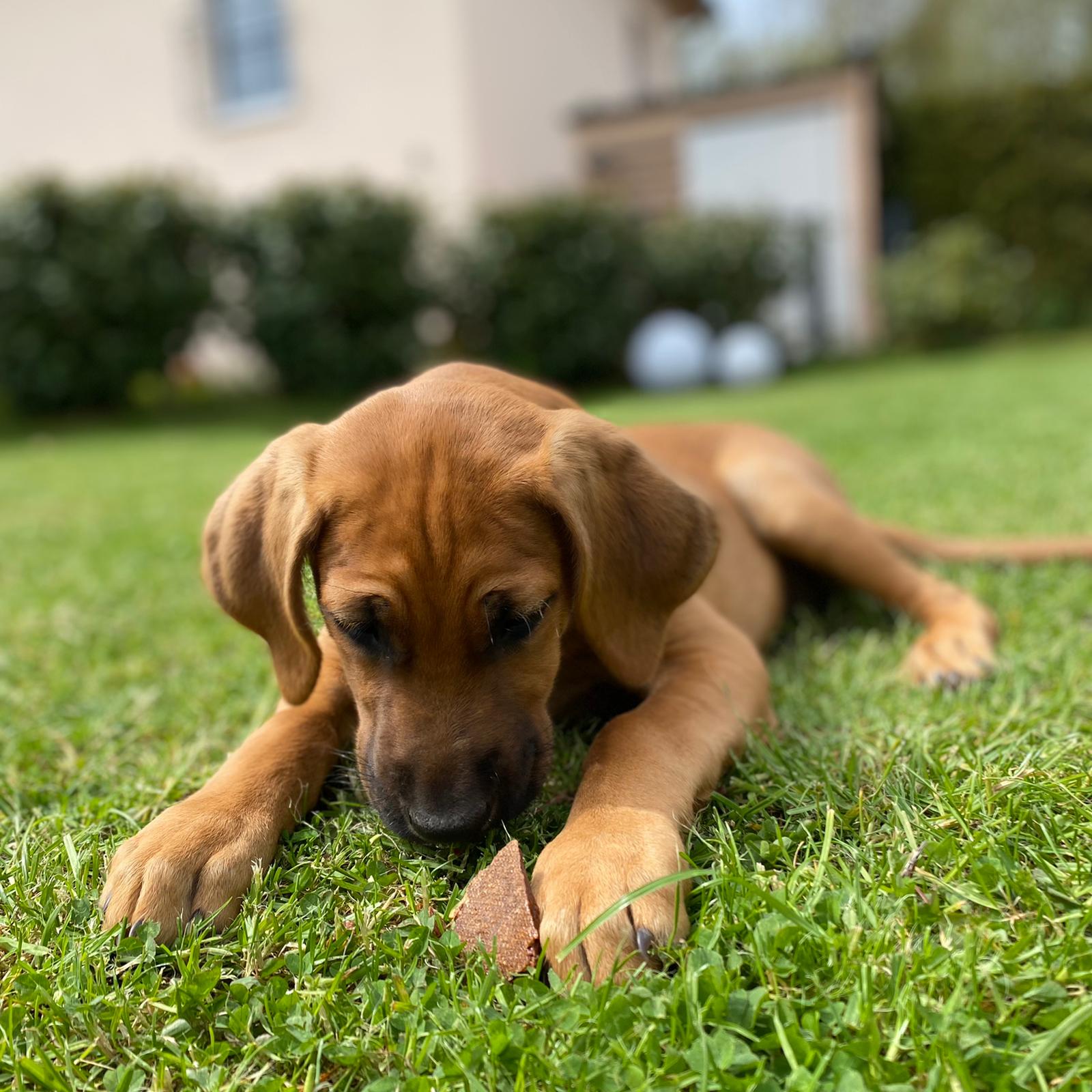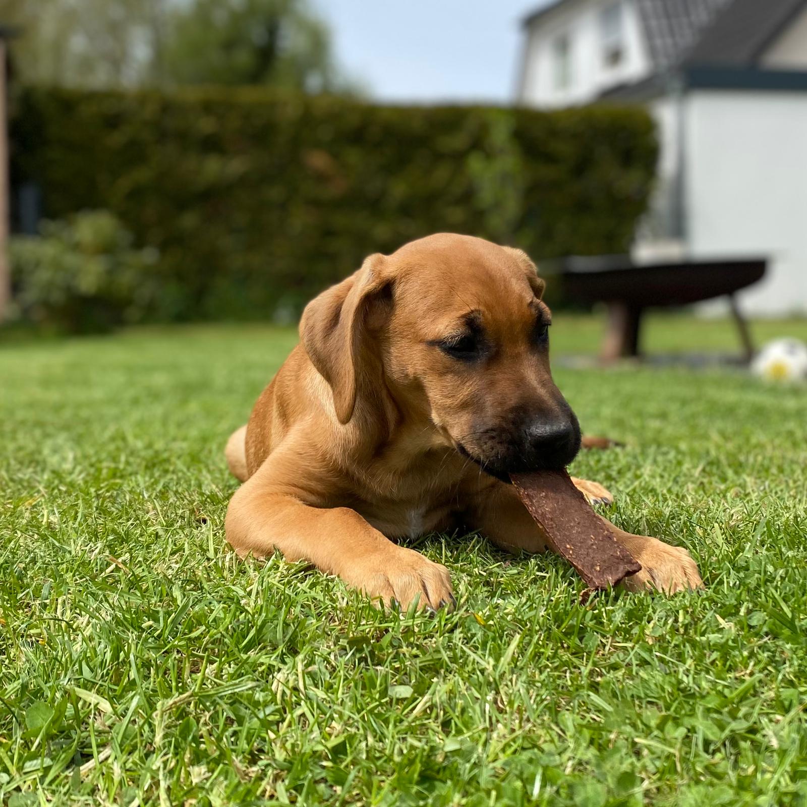 Testen durfte dieses feine Produkt unser Angestellter "CLEO" aus der Qualitätsabteilung. CLEO - ein erst 3 Monate alter Broholmer-Rüde war total begeistert von dieser natürlichen Eiweiß-Bombe! Ganz genüsslich machte er sich über diesen Kauspaß her. Cleo's offizielles Testergebnis: Natürliche Spitzenklasse! Vielen Dank an die Fotografin Kristin! Eine tolle Fellnase habt Ihr da!
