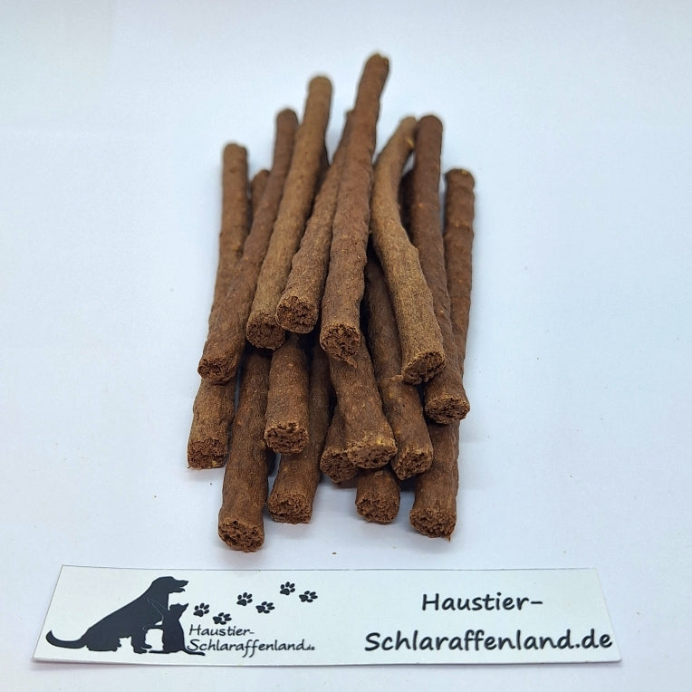 Bei der Herstellung, Verpackung und Transport der Fleisch-Sticks fällt auch Bruch an. D. h. in der Verpackungseinheit können auch bis zu 10 % Bruch dabei sein. Die Herstellung mit natürlichen Zusatzstoffen wie z. B. die Stärke der Maniokwurzel (Tapioka) lässt leider kein stabileres Endprodukt zu. Auch der geringe Fett- und Feuchtigkeitsanteil lässt die Sticks gerne brechen. Natürliche Qualität steht hier vorne an! Chargen- & naturbedingt kommt es vor, dass die Sticks mal dunkler und mal heller, mal größer und mal kleiner sind. Dies stellt keinen Qualitätsmangel oder Reklamationsmangel dar.
