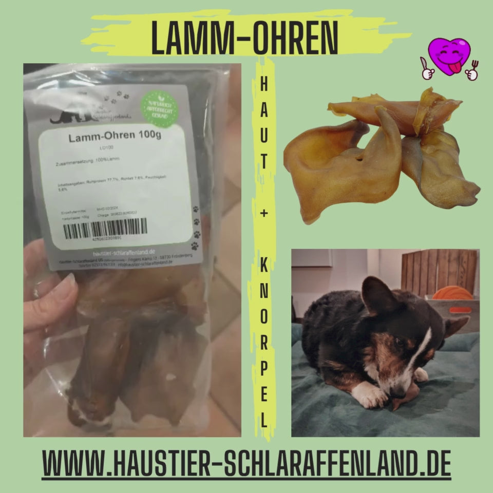 Bei diesen getrockneten Ohren vom Lamm können Feinschmecker die „Ohren spitzen“ denn die Ohren sind ganz besonders mager und dadurch sehr gut verdaulich und bekömmlich. Auch Hunde mit Gewichtsproblemen und Allergie-Hunde können hier richtig „reinhauen“ - ein echter Genuss ohne Reue! Die Lammohren bestehen aus Knorpel und Haut sorgen durch ihre Festigkeit und ihr unwiderstehliches Aroma für ein lang andauernden Kauspaß. Und ganz nebenbei machen sie nicht nur Lust auf mehr, sondern Sie sind auch noch eine natürliche Zahnbürste für Deine Fellnase. Auf jeden Fall wird sich Dein Hund bis über beide Ohren in dieses Kau-Snack verlieben.