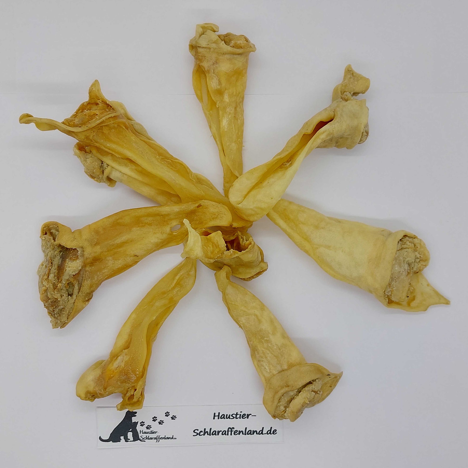 Bei diesen getrockneten Ohren vom Lamm können Feinschmecker die „Ohren spitzen“ denn die Ohren sind ganz besonders mager und dadurch sehr gut verdaulich und bekömmlich. Auch Hunde mit Gewichtsproblemen und Allergie-Hunde können hier richtig „reinhauen“ - ein echter Genuss ohne Reue! Die Lammohren bestehen aus Knorpel und Haut sorgen durch ihre Festigkeit und ihr unwiderstehliches Aroma für ein lang andauernden Kauspaß. Und ganz nebenbei machen sie nicht nur Lust auf mehr, sondern Sie sind auch noch eine natürliche Zahnbürste für Deine Fellnase. Auf jeden Fall wird sich Dein Hund bis über beide Ohren in dieses Kau-Snack verlieben.