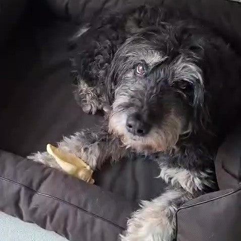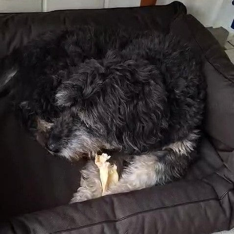Im Produktvideo seht Ihr übrigens "Herrn von Bödefeld", ein Doodle-Rüde aus Fröndenberg. Der Mix aus Kaukasischer Owtscharka + Cocker Spaniel und Pudel ließ sich das fettarme Lamm-Ohr sehr entspannt schmecken. Danke an Frauchen Bärbel und Danke an die Massage-Praxis Schmidt, dass Ihr einen Bürohund erlaubt!