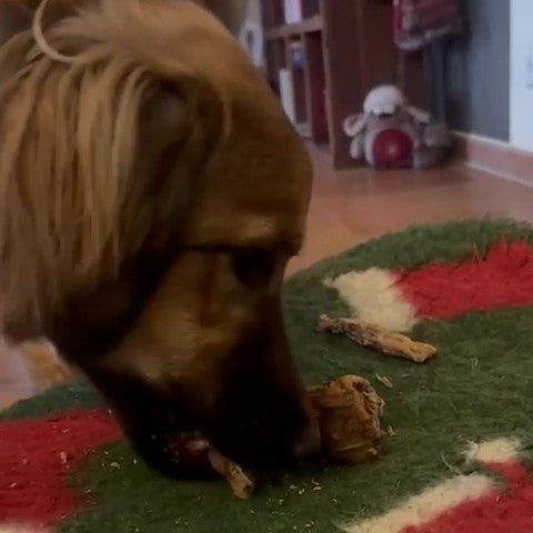 Bitte lasse deinen Hund beim Kauen auf Knochen nie unbeaufsichtigt! Auch wenn es sich um ein Naturprodukt handelt, kann es beim Zerkauen zu Splitterbildung kommen. Achte daher stets auf ein sicheres Kauverhalten und sei während des Verzehrs in der Nähe.