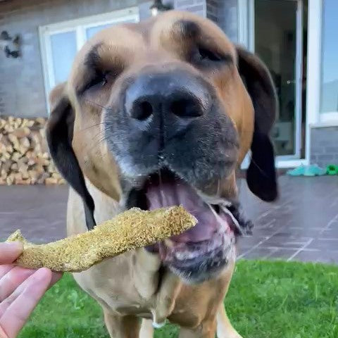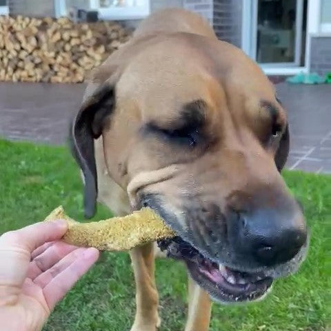 Bei Rinder-Pansen wird Dein Vierbeiner die „Ohren spitzen“. Alfi durfte zum Futter-Check ran. Sie ist eine Mischung aus Broholmer, Deutsche Dogge und Old English Mastiff. Bisher kannte Alfi nur den normalen, braunen Pansen, also mal wieder das erste Mal, etwas köstlich Neues auszuprobieren. Alfi-Fazit: Ein leckerer Happen für zwischendurch mit für Hunde einem extrem leckereren Geruch, gut auch für die Zahnreinigung.